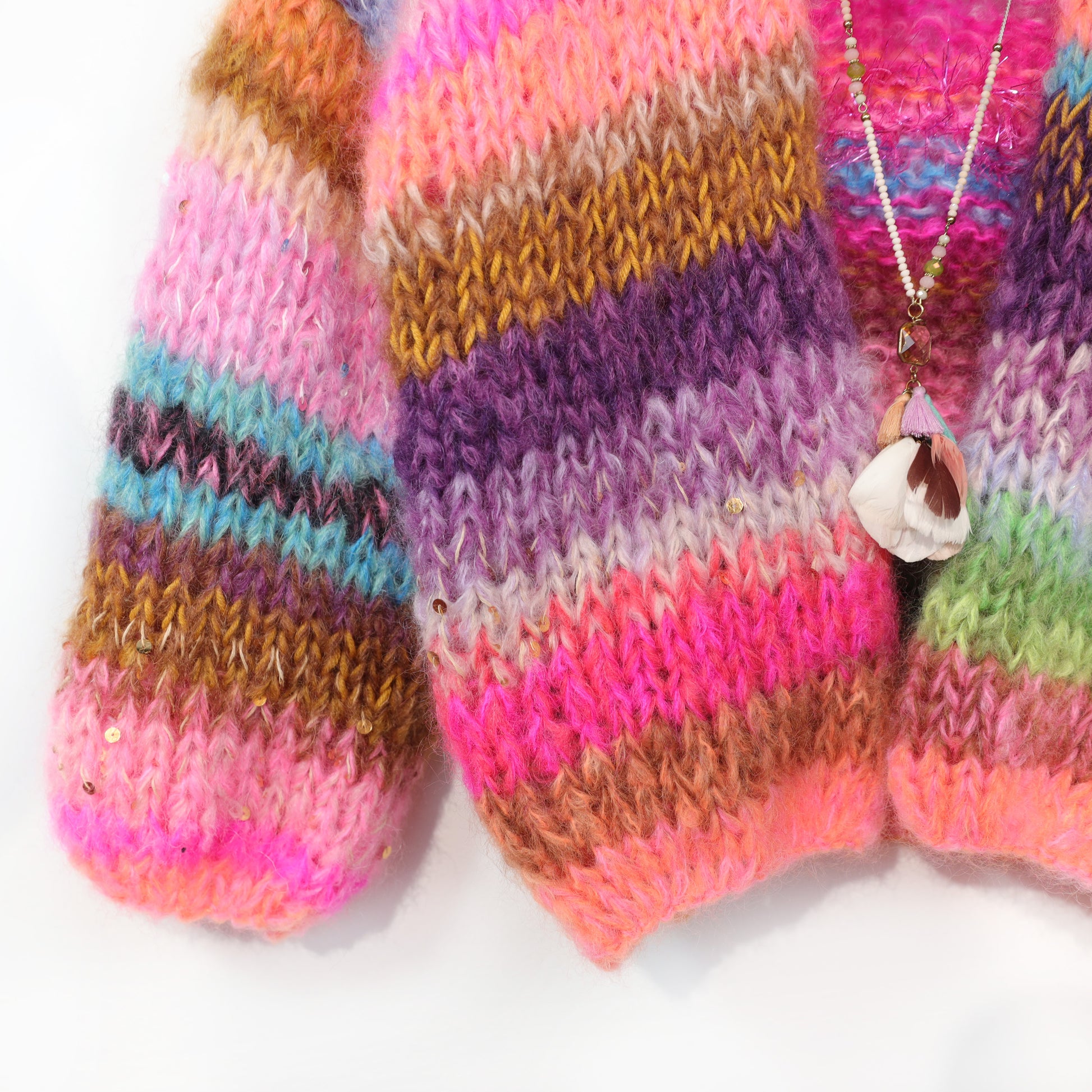 If you want to knit this piece in multiple colours as we did, divide the total yardage you need between the different shades. There is no colour explanation included because we changed colours almost every row.